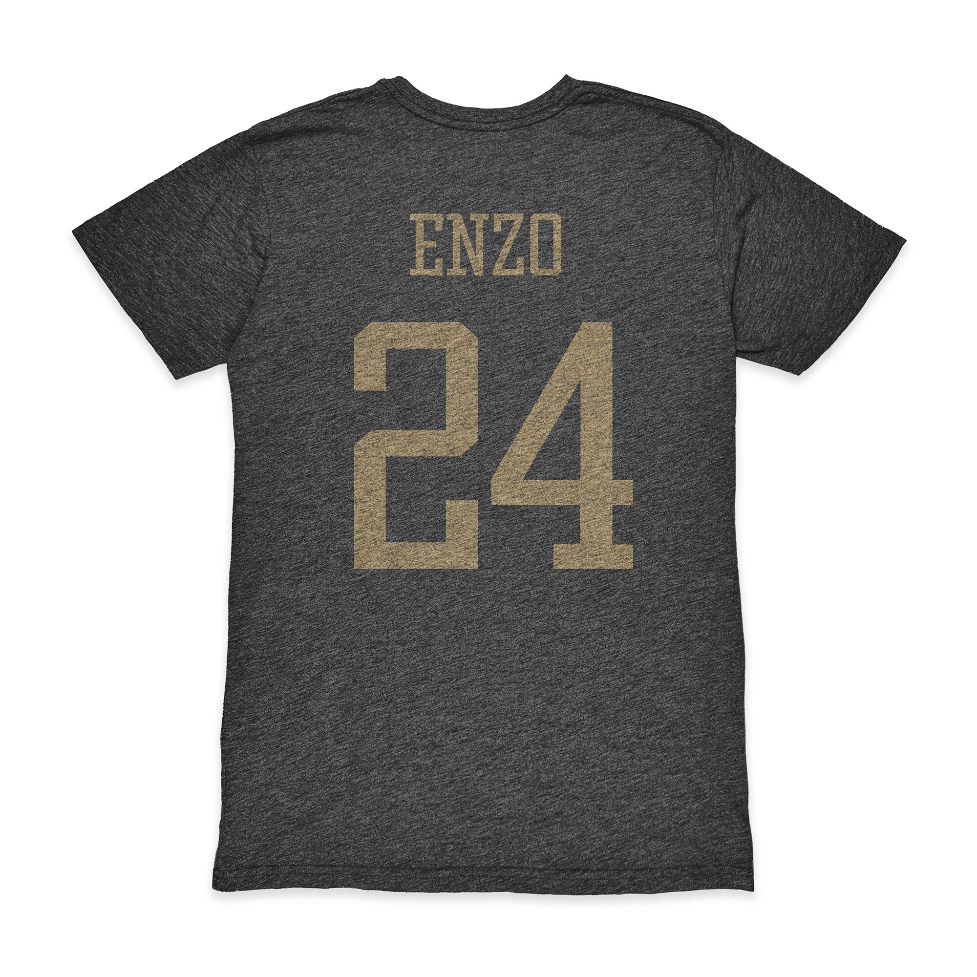 • Distressed screen print of the player’s name and number on the back