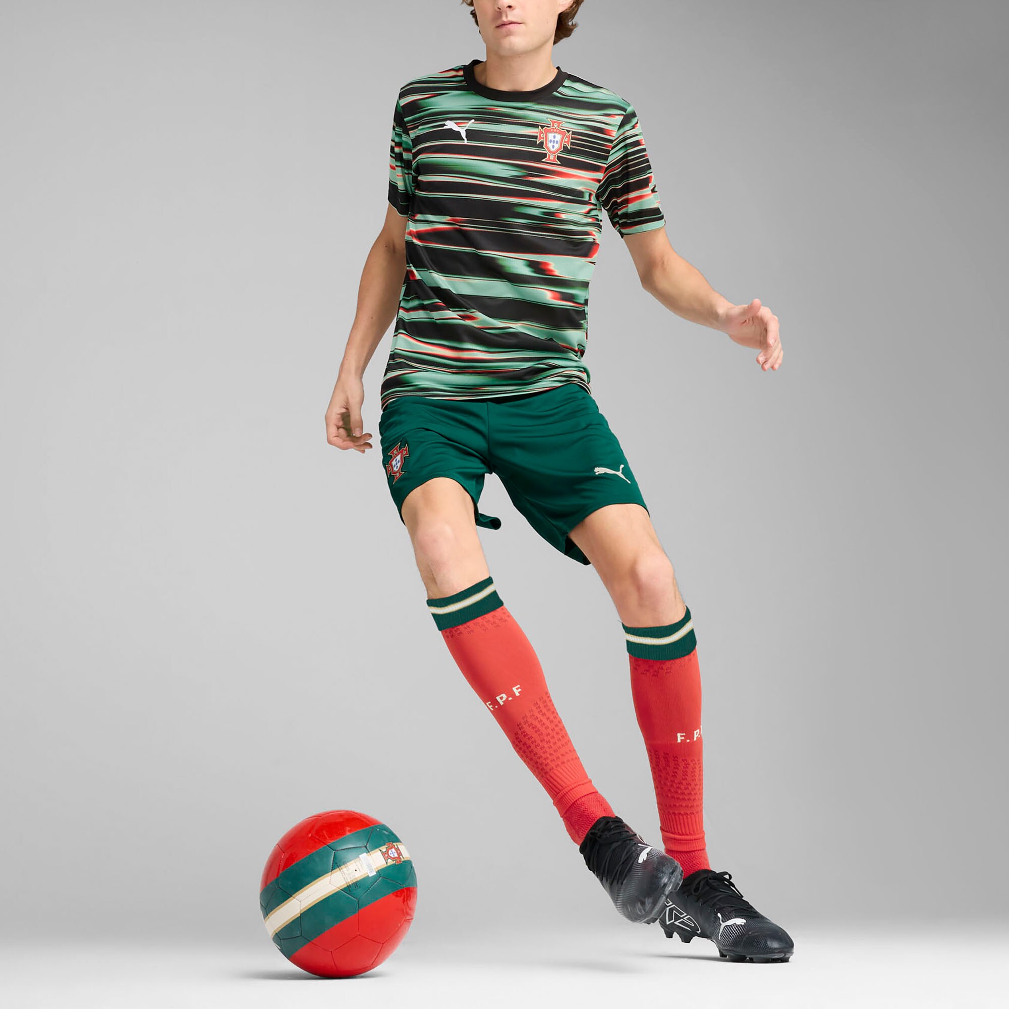 • Gear up and show your support for the Portugal National Team with this 2025 Pre-Match Jersey from Puma. This sleek pre-match jersey boasts a bold, fully sublimated pattern that stands out without any added bulk from stitching or raised details. The lightweight, breathable polyester fabric ensures you stay cool and comfortable, whether you're cheering from the stands or warming up for a game of your own.